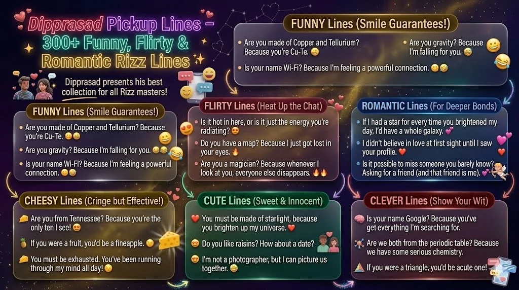 “Dipprasad Pickup Lines infographic with 300+ funny, flirty, romantic, cheesy, and clever rizz lines for Tinder, texting, and Instagram.”
