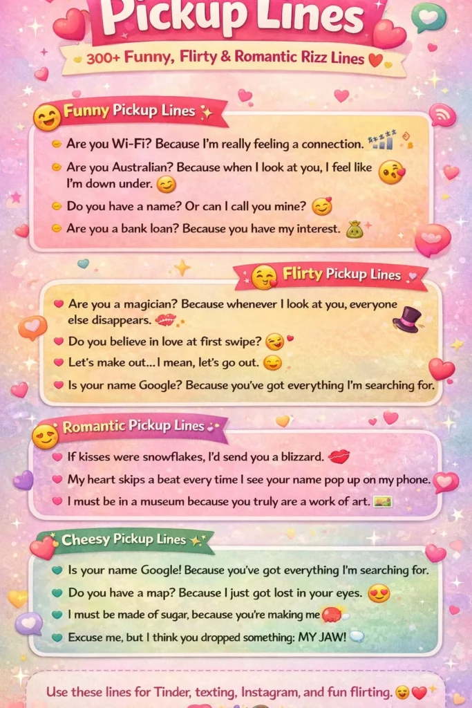 Dipprasad pickup lines are more than just words—they’re an imaginative, charming, and personal way to spark connection, laughter, and attraction. Whether you’re aiming for humor, flirtation, romance, cheesiness, or cleverness, these lines serve as an icebreaker that can transform an ordinary conversation into something Memorable.
